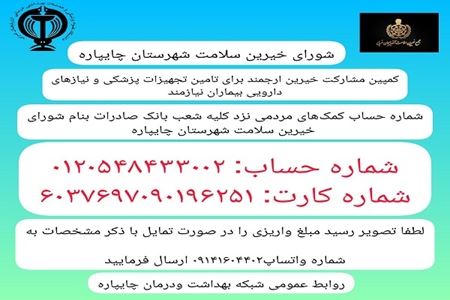 به اطلاع همشهریان عزیز می رساند شورای خیرین سلامت شهرستان چایپاره، برای جذب کمکهای مردمی و خیرین عرصه سلامت شهرستان، اقدام به افتتاح حساب نزد بانک صادرات به شرح ذیل نموده است.